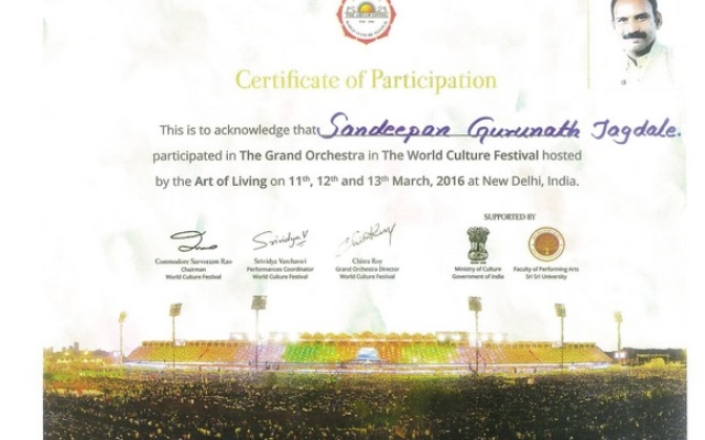 1) सांस्कृतिक मंत्रालय भारत सरकार प्रायोजित व श्री युनिव्हर्सिटी आयोजित दिनांक 11 ते 13 मार्च 2016 या कालावधीत नवी दिल्ली येथे आयोजित आंतरराष्ट्रीय पातळीवरील ‘विश्व संस्कृतिक महोत्सवा’त तबला वादन.
