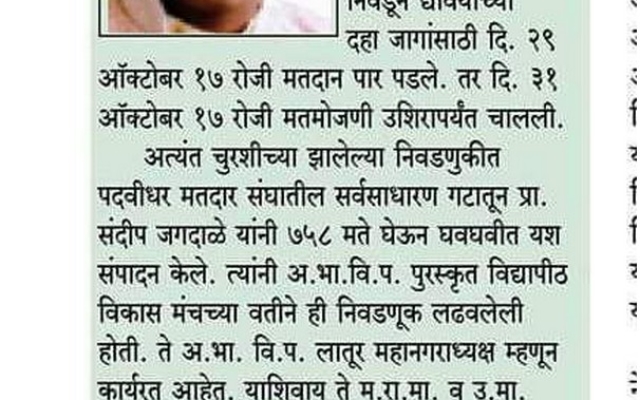 ५) कवयित्री बहिणाबाई चौधरी उत्तर महाराष्ट्र्र विद्यापीठ,जळगाव येथे परफॉरमिंग आर्टस तदर्त अंतरविद्याशाखीय अभ्यास विद्याशाखेवर अभ्यासमंडळ सदस्य म्हणून नामनिर्देशन करण्यात आले आहे.