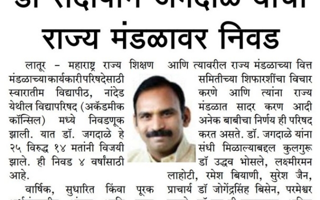 ८) महाराष्ट्र राज्य माध्यमिक व उच्च माध्यमिक शिक्षण मंडळाच्या कार्यकारी परिषदेवर स्वारातीम विद्यापीठ,नांदेड विद्यापरिषधेच्या वतीने नामनिर्देशन.